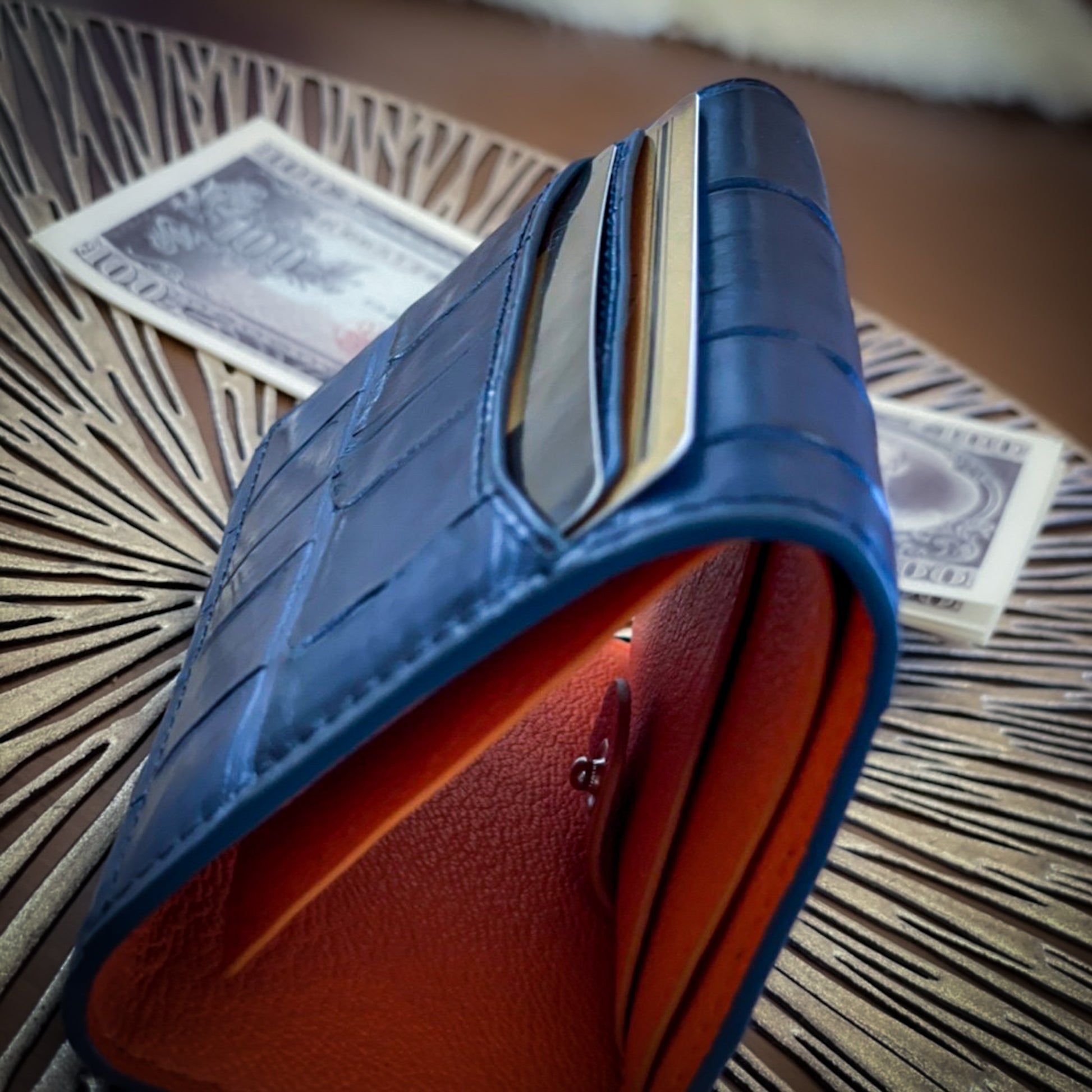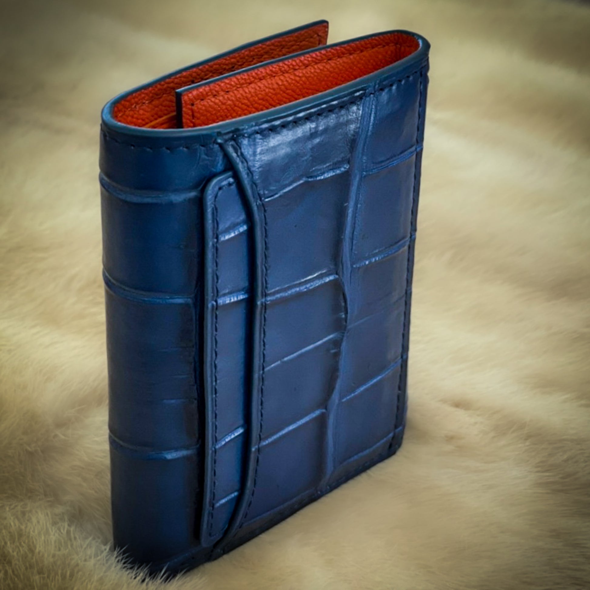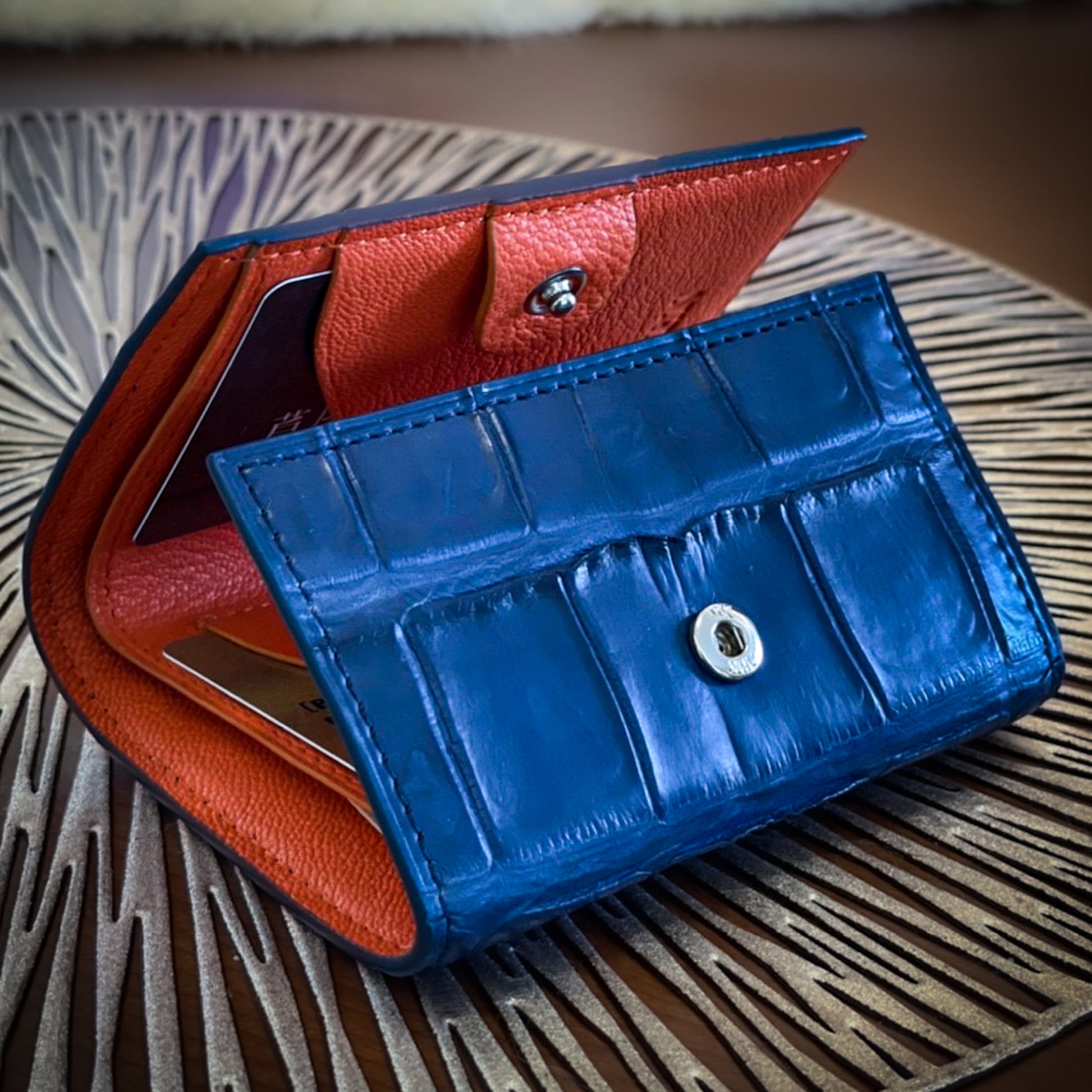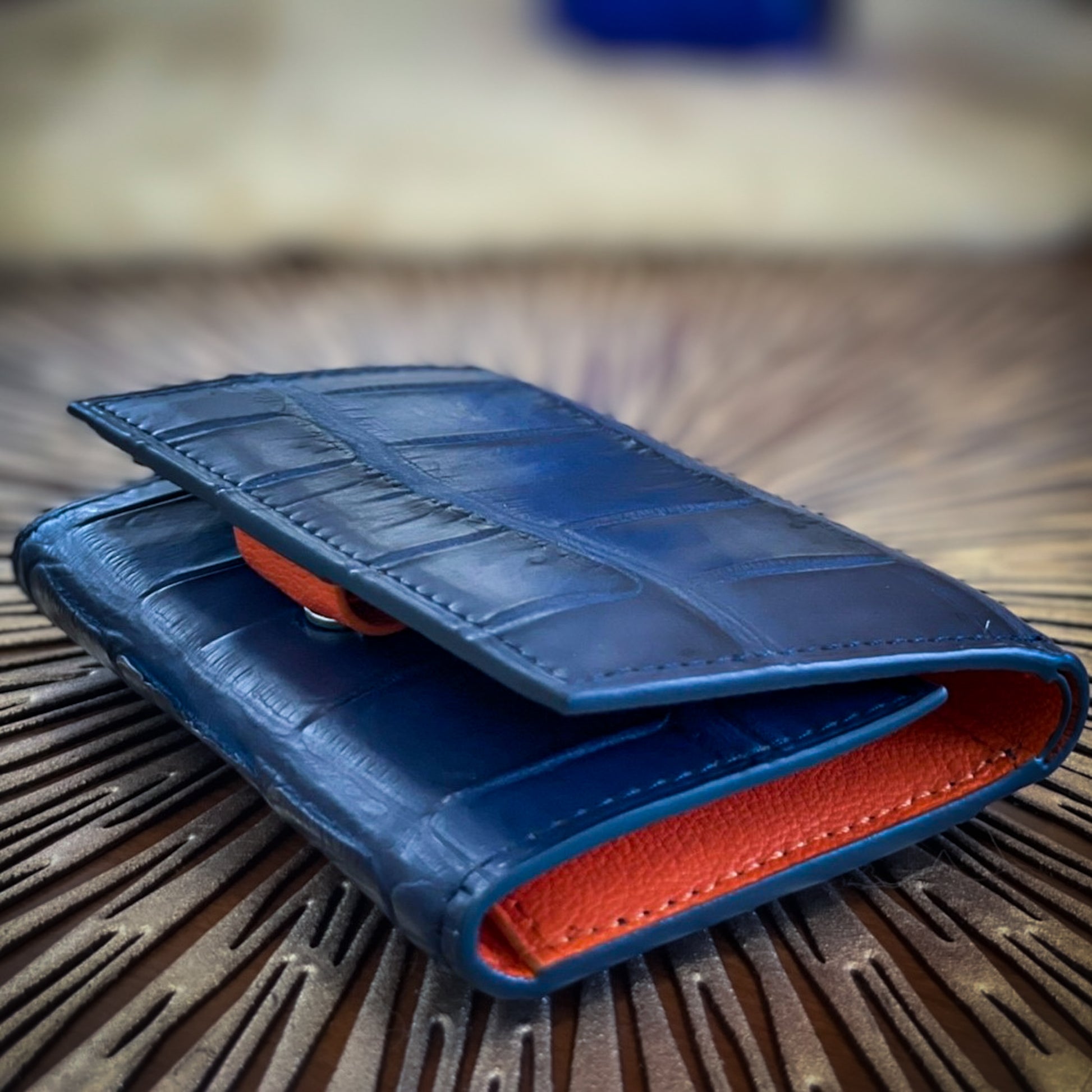 美しい海のようなロイヤルブルーのカシミヤクロコダイルと、南国の日差しのようなオレンジのシェーブル(山羊革)